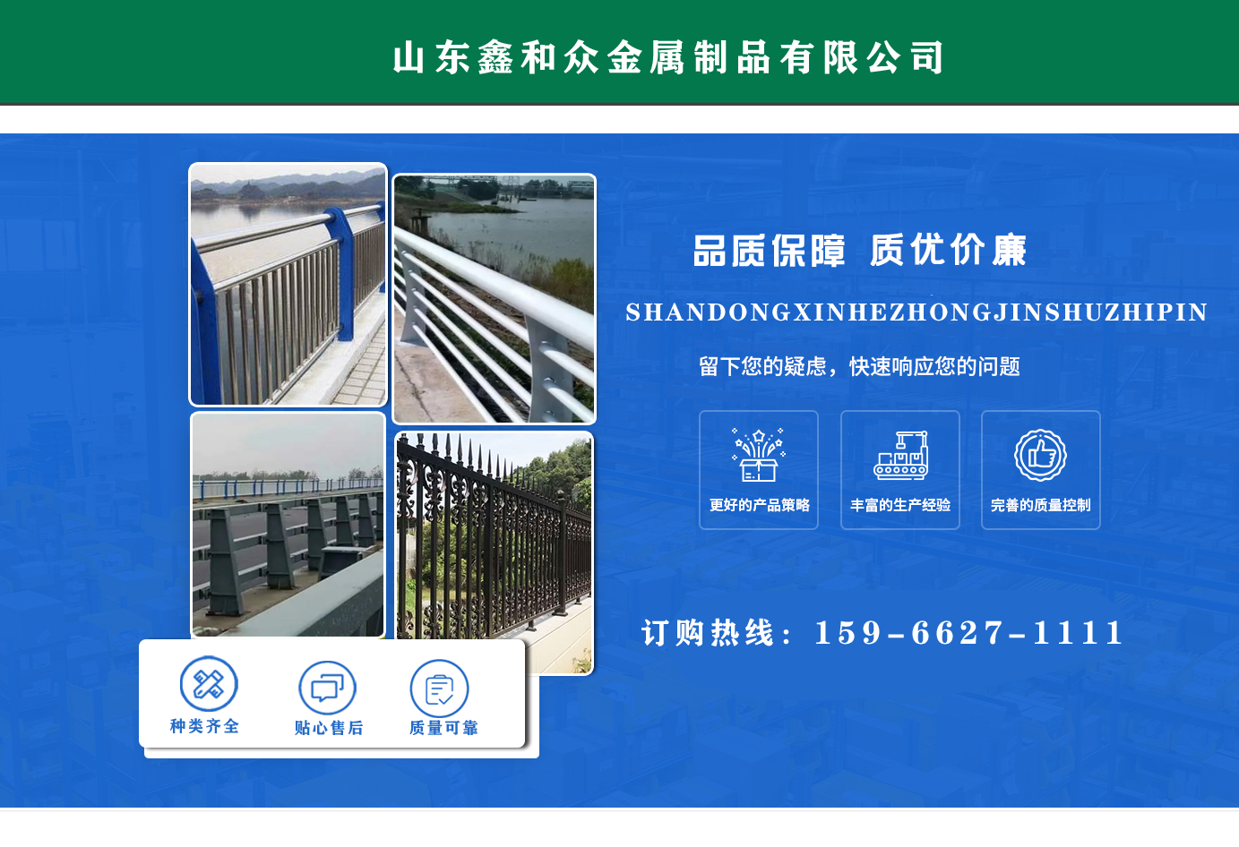 山東鑫和眾金屬制品有限公司主要產(chǎn)品有防撞護欄,橋梁護欄,道路護欄,河道護欄,不銹鋼護欄等護欄。提供設計方案,一站式定制,包您滿意價格優(yōu)惠,歡迎來電咨詢! 公司常年從事銷售護欄防撞護欄,橋梁護欄,道路護欄,河道護欄,不銹鋼護欄,橋梁鋼護欄,河道燈光護欄等。產(chǎn)品廣泛應用于橋梁、河道、旅游景區(qū)、道路、公路、公園、小區(qū)、景觀、道路防撞等領(lǐng)域。 公司產(chǎn)品均采用優(yōu)質(zhì)不銹鋼材料,符合相關(guān)標準。各種型號不銹鋼復合管及護欄,質(zhì)量嚴格把控。產(chǎn)品強度高、耐腐蝕、焊接牢固、抗沖擊、性能好,防撞護欄結(jié)構(gòu)簡單、美觀實用大方?! g迎前來訂購!...